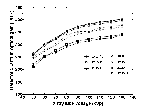CsI(Tl)的最重要特征是其高光產率(≥104光子/ MeV),并且其發射光譜在約550 nm處具有最大值,與非晶和結晶硅光電二極管完全兼容。研究了CsI:Tl單晶閃爍體的發光效率與X射線乳腺攝影和一般X射線成像所用能量范圍內的晶體厚度和X射線管電壓的關系。